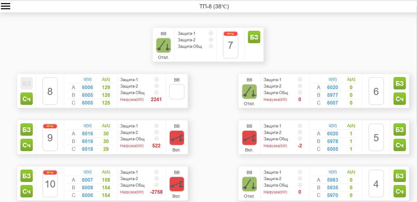 Сайт отображает все технически оснащенные подстанции, а также состояния содеращихся в них ячеек.